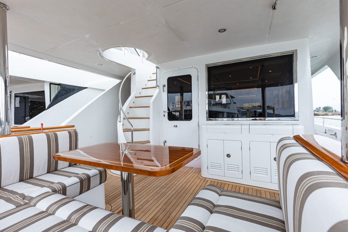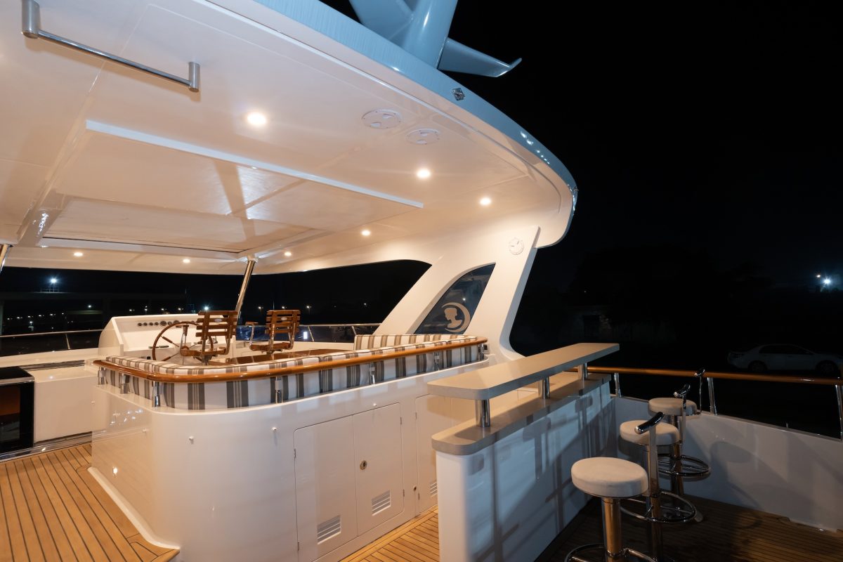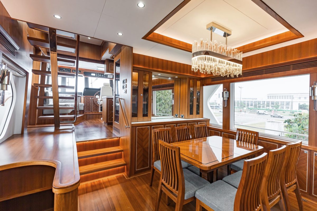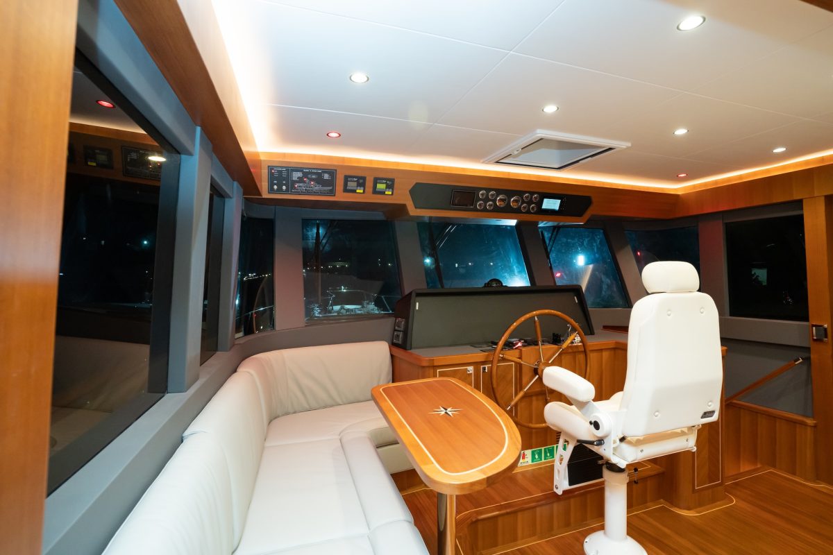 What is catching eyes is the elegant combination of modern styling and the line of a reassuring ocean going vessel. It shows a number of the Selene family traits with her powerful raised pilothouse, Portuguese bridge, wide upper deck, and side-deck walk-arounds which provide safety and convenience for passengers of all ages ( wide-body or semi-wide-body is optional.) But a new approach is also visible in the addition of the large side windows in the hull and the curvy and sleek lines of the flying bridge.